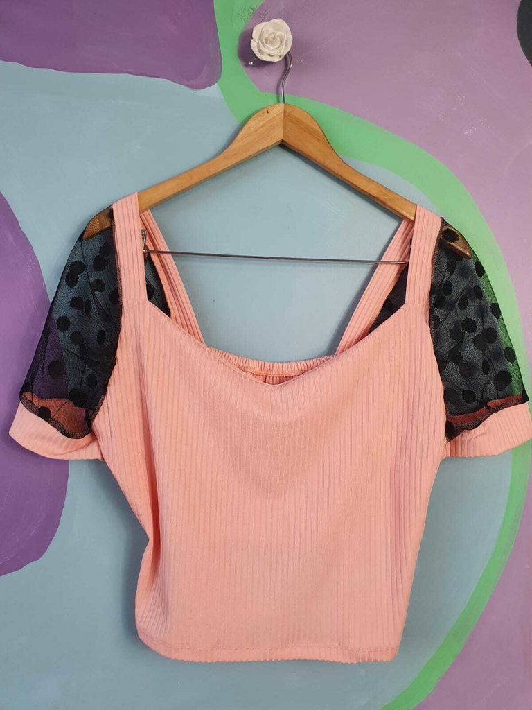 Blusinha em poliester elástico canelado, possui mangas de tule