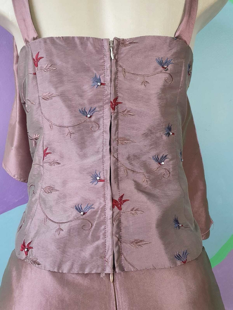 Vestido de festa separado em corpete e saia, tecido do vestido e corpete em tafetá - corpete bordado com pontos de strass
